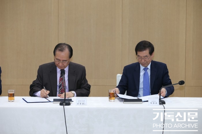 총회장 안명환 목사(왼쪽)와 박원순 서울시장(오른쪽)이 기후변화 대응 및 에너지 절약 실천 확산을 위한 MOU에 사인하고 있다